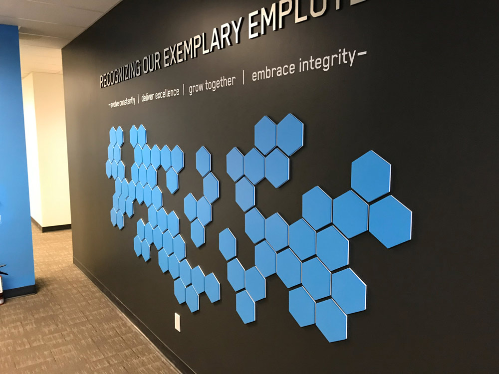 We install non-illuminated signage including dimensional logos, vinyl graphics, SEG frames, wayfinding systems, suspended signs, and architectural branding elements. We don’t handle channel letters, sign boxes, or any electrical signage. We don't install real estate post signs!