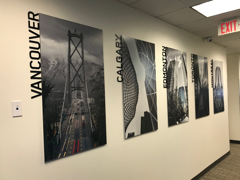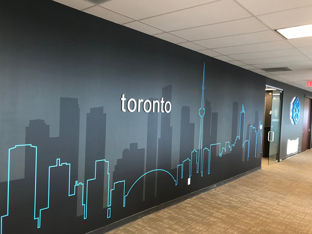 We were awarded the installation part at their Toronto office. We worked alongside architects, designers, and Takeform to install the full signage and graphics package for this project. The project included wall murals, custom glass graphics, logo features, and a lot of way-finding signs—most of it installed during the buildout stage, with tight coordination and no room for error.
